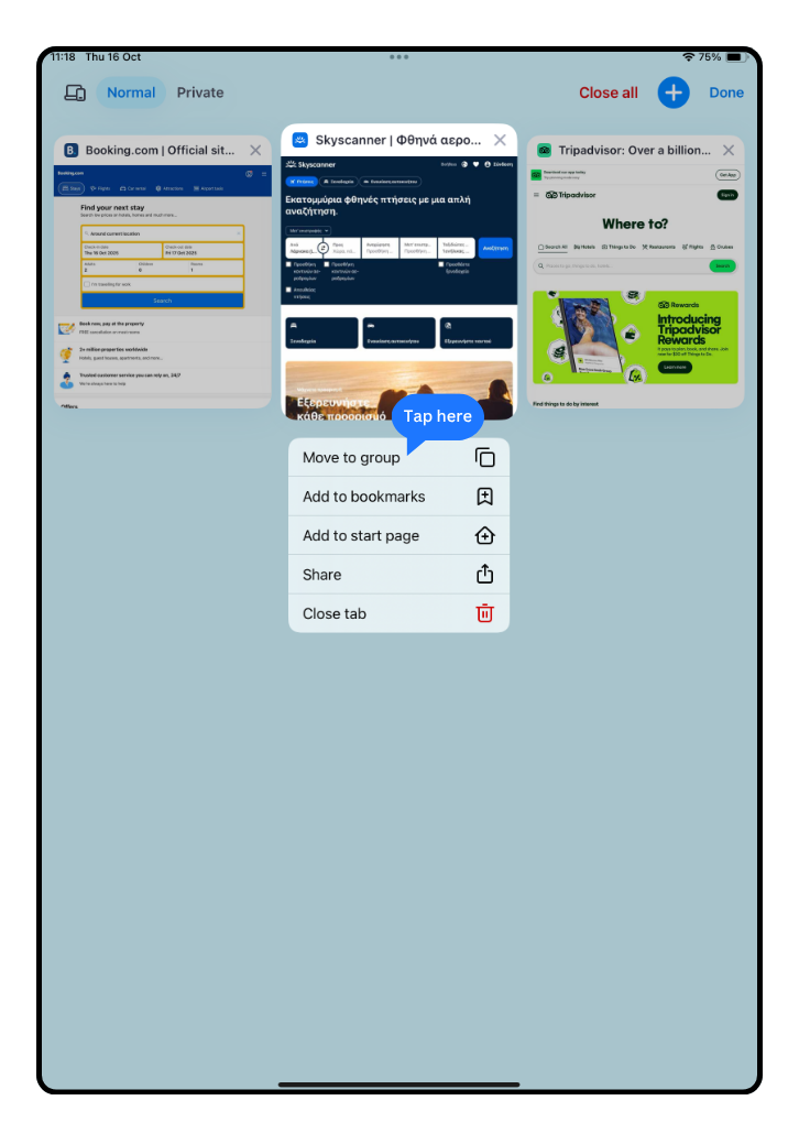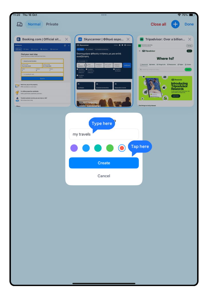 2. Open Tabs manager:3. Long tap any new tab:4. Select 'Move to group':5. Enter group name and select color in the menu, then tap 'Create' button: