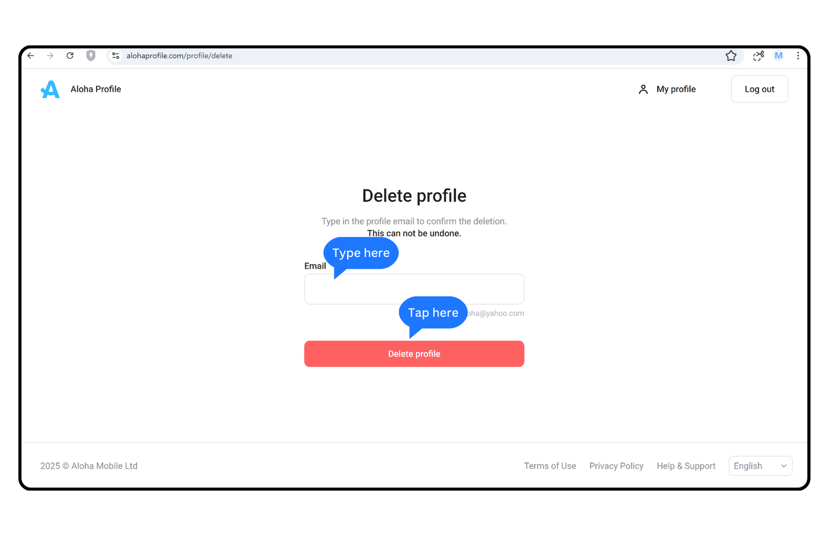 3. Enter your Aloha Profile email address and confirm with 'Delete' button: