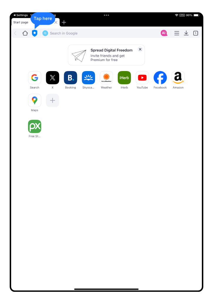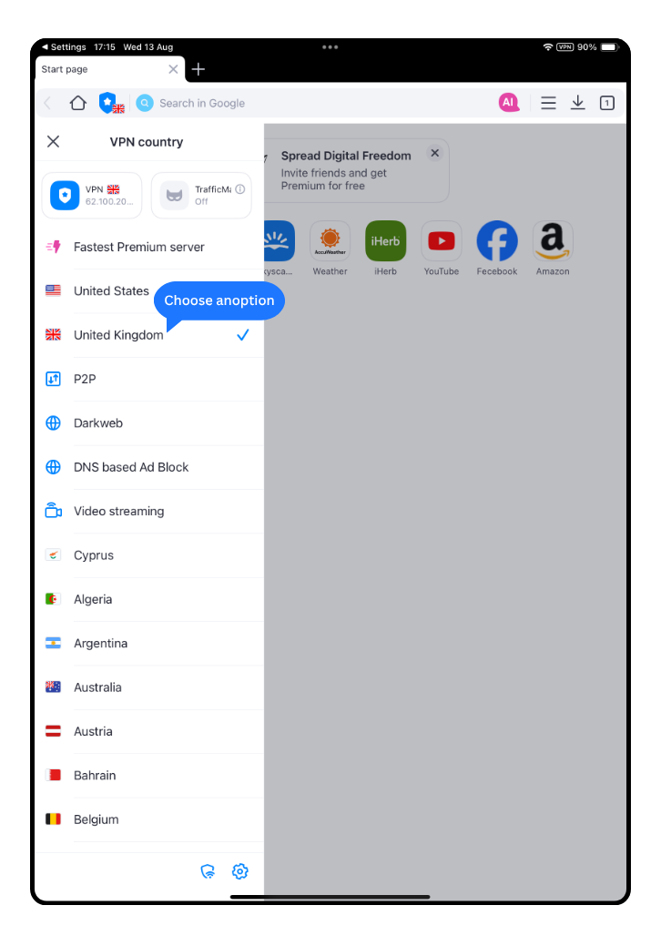 2. Long tap the shield icon:3. Select any country in the list to change the server: